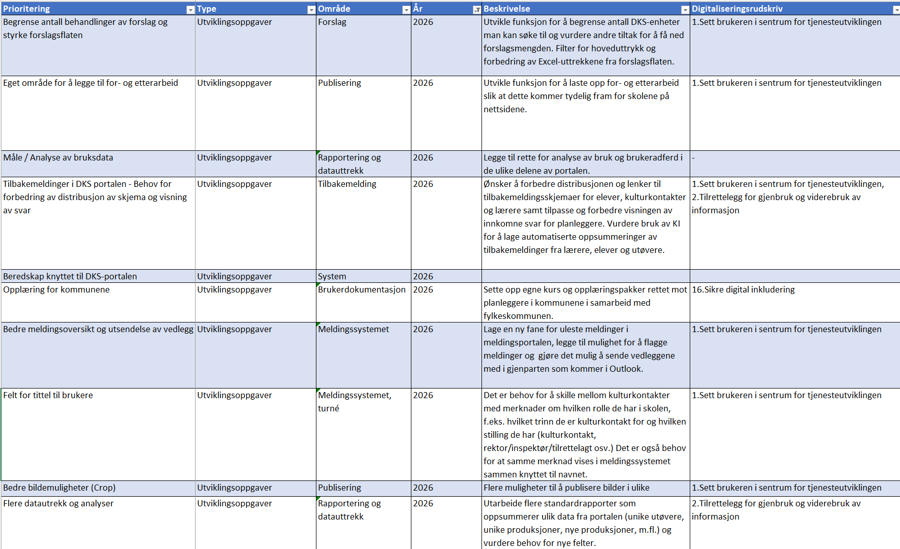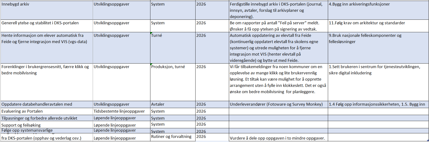 Oversikt over prioriterte oppgaver for DKS-portalen i 2026: